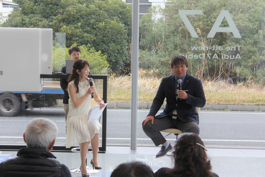アウディ幕張様でニューA6デビュー記念イベントで、元プロ野球選手里崎智也氏のトークショーで大野が司会をしました。 2019/3/23に里崎氏の絶妙のトークに会場は大変盛り上がりました。当社でイベントの構成・演出・撮影・音響の担当もさせていただきました。